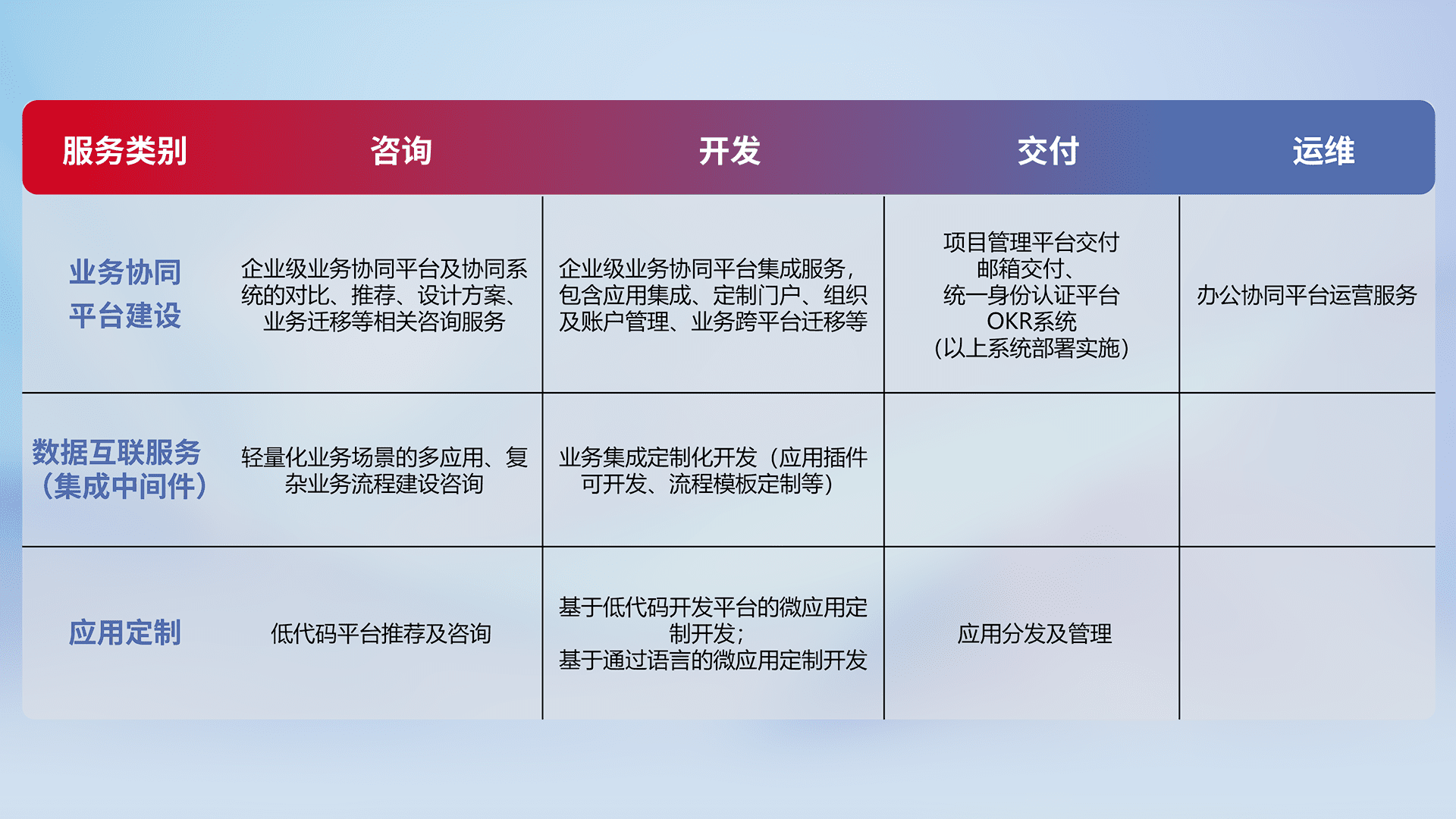 针对钉钉、、、企微、、IDaas等平台级产品提供产品的规划、、、方案、、、、交付、、定制化开发等服务,,实现如统一协同办公、、、智能客户服务、、、混合会议管理、、、、智能数据查询、、、、等业务场景,,实现数字化转型。。。