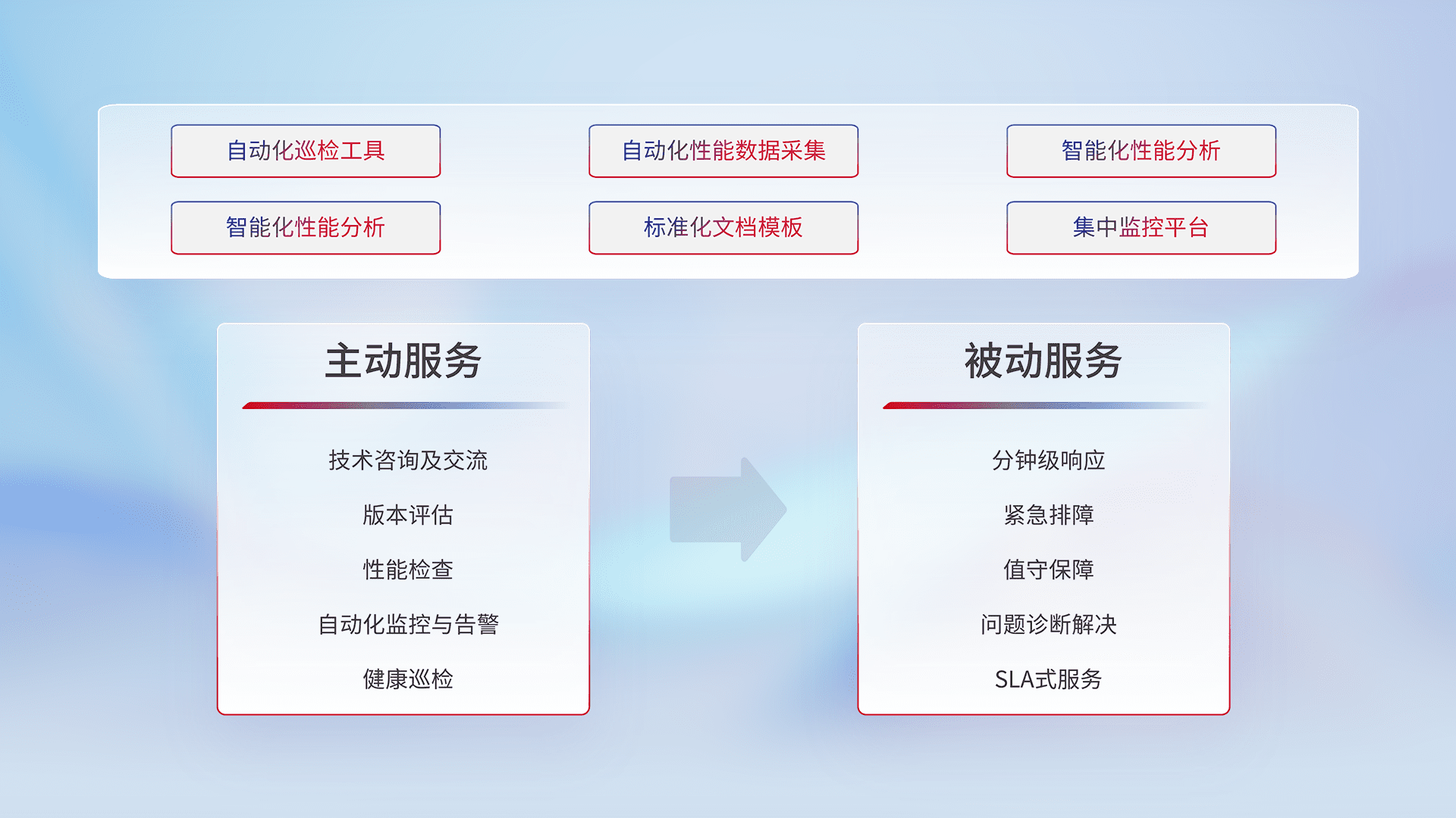 智能化工具和标准化文档,,,保障服务质量,,,提供主动服务(包含技术咨询、、、版本评估、、、、性能检查、、自动化监控与告警、、、、健康巡检)和被动服务包含(分钟级响应、、、、紧急排障、、值守保障、、、、问题诊断解决、、SLA服务)。。。。
