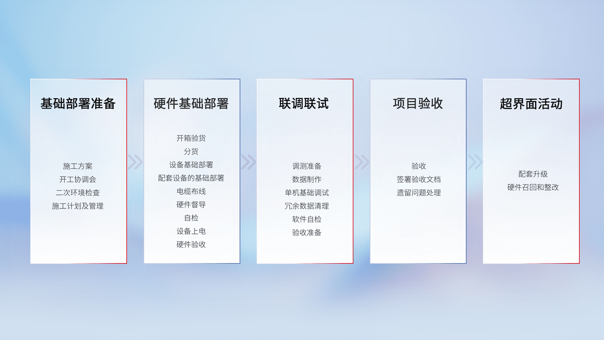 从基础部署准备、、、硬件基础部署、、联调联试、、、项目验收、、、、越界面活动的全过程可追溯,,,,保证施工质量和进度。。。